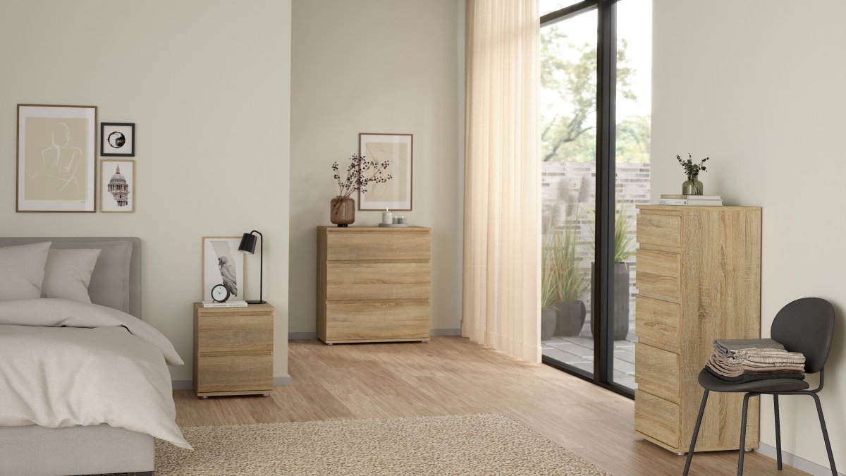 TVILUM Pepe byrå - vit högblank / naturligt trä / ekfaner, med 5 lådor