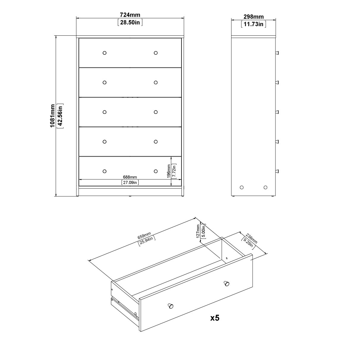 TVILUM Pepe byrå - vit högblank / naturligt trä / ekfaner, med 5 lådor