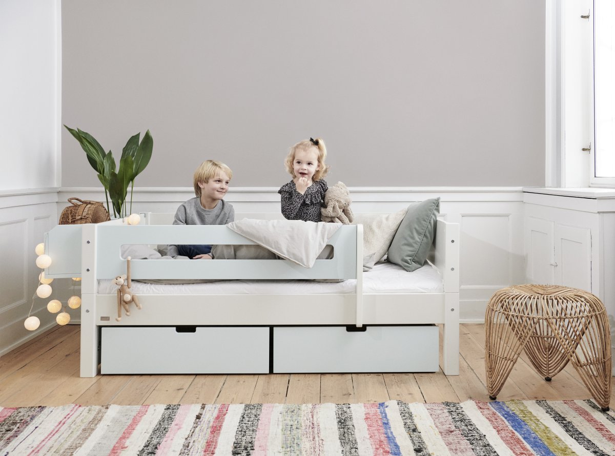 Kombinationen av sovyta och förvaring gör Mimer lämplig för både mindre och större barnrum, där funktion och ordning går hand i hand.