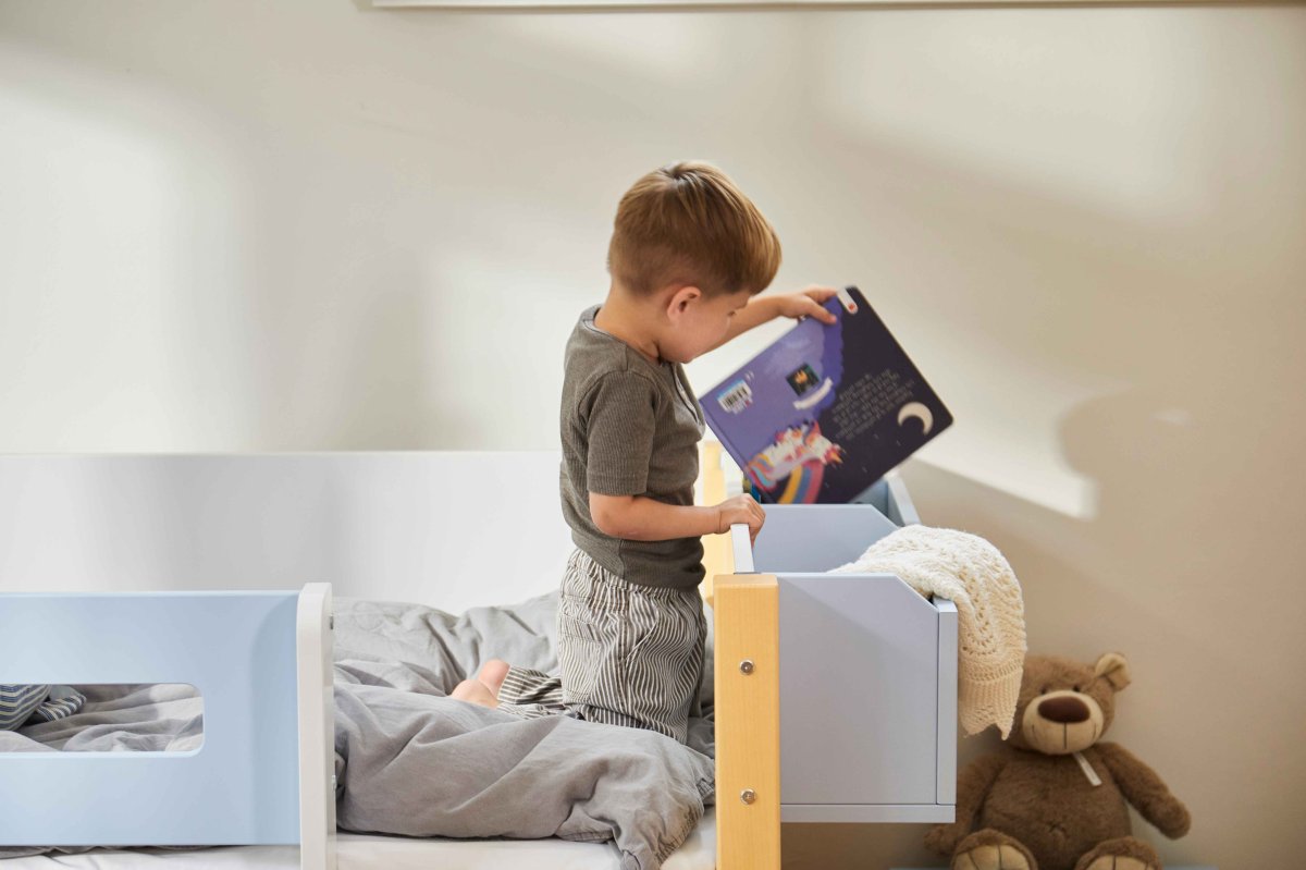 Ariel barnsäng - flexibel lösning med förvaring och daglig funktion Ariel barnsäng har utvecklats som en funktionell sänglösning med integrerad förvaring som skapar ordning och ro i barnrummet. De rymliga lådorna under sängen ger gott om plats för sängkläder, leksaker och vardagliga förnödenheter, medan den öppna hyllan mitt i sängen låter dig lyfta fram böcker, leksaker och personliga detaljer. Hyll- och förvaringsmodulerna kan senare användas fristående, vilket ger en flexibel lösning som kan anpassas om sängens struktur förändras över tid. Det integrerade ryggstödet gör sängen lämplig som sittgrupp under dagen och bidrar till mångsidig användning i vardagen. Möjligheten att lägga till en sänggrind på framsidan skapar extra trygghet, särskilt för mindre barn. Ariel barnsäng är designad och producerad i Danmark och är en del av Manis-hs flexibla byggsystem. Sängen kan konfigureras i upp till 14 vackra färger, så uttrycket kan anpassas till rummets inredning och familjens behov.