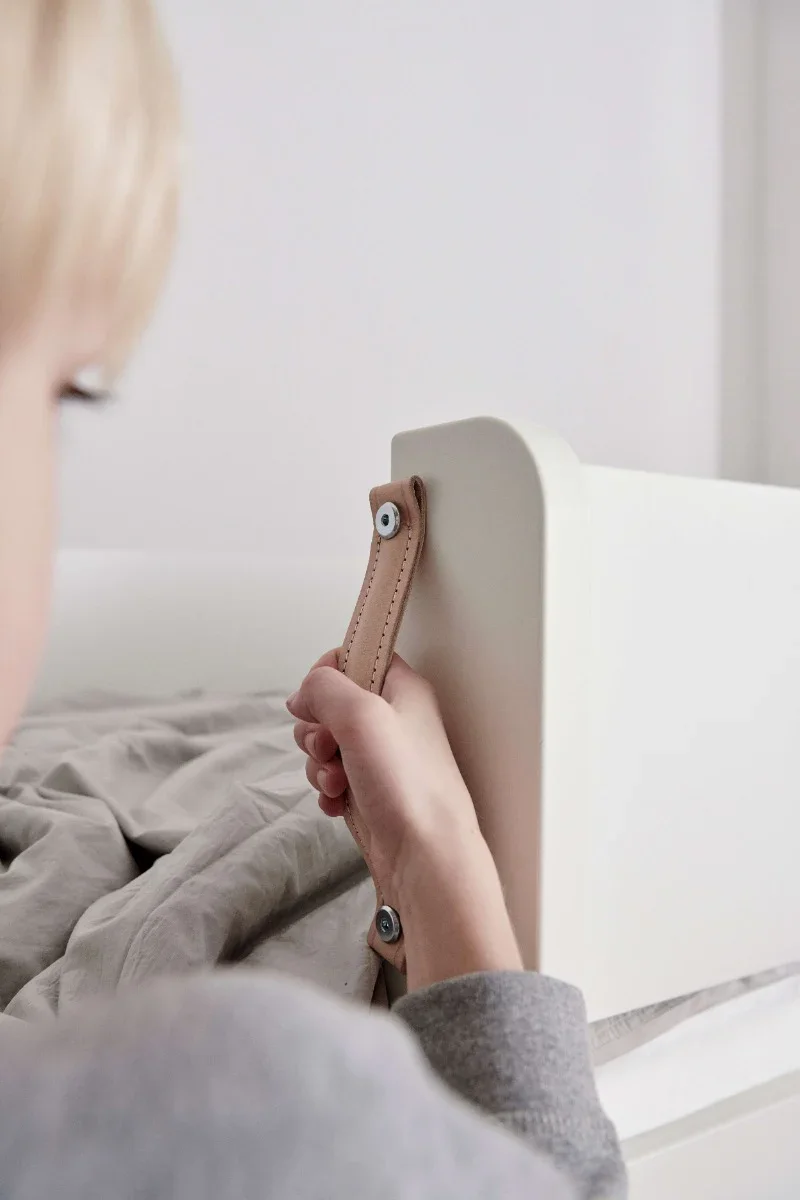 Detta säkerhetskit har utvecklats för att öka säkerheten vid användning av stegar för höga sängar och våningssängar och är särskilt lämpligt för mindre barn vid övergången från spjälsäng eller juniorsäng. Kitet bidrar till en säkrare och stabilare åtkomst till sängen vid daglig användning. Kitet består av ett grepp i slitstarkt fullnarvsläder och halkfri tejp för stegpinnarna, vilket tillsammans förbättrar både grepp och fotfäste. Materialen har valts ut med fokus på hållbarhet och funktion, samtidigt som uttrycket förblir enkelt och dämpat. Säkerhetskitet passar alla Manis-h stegar. Vid användning på en Huxie-stege kan halkfri tejp monteras på stegpinnarna, medan greppet inte kan monteras på denna modell.