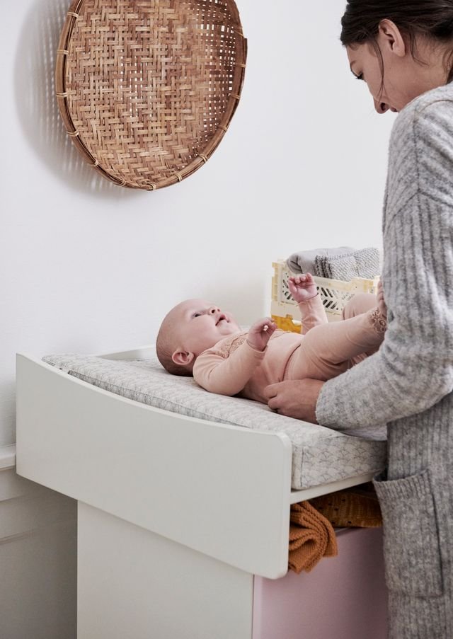 Skötbordskombination - byrå med avtagbar skötbordsskiva Denna skötbordskombination består av en byrå med tre rymliga lådor och en avtagbar skötbordsskiva, som tillsammans skapar en funktionell och säker lösning för sköttid. Byrån är tillverkad med fokus på stabilitet och lång hållbarhet och ger gott om plats för förvaring av blöjor, kläder och andra nödvändiga saker i barnets vardag. Skötbordsskivan är utformad med en bra arbetsyta och kan tas bort utan att lämna märken på byrån. Detta gör det möjligt att använda byrån som en oberoende förvaringsmöbel, även när behovet av skötbord upphör. Lösningen är en del av Manis-hs flexibla byggsystem och kan anpassas allt eftersom behoven förändras. Produkten är designad och producerad i Danmark och kombinerar funktionalitet med ett lugnt och tidlöst formspråk. Byrån kan konfigureras i upp till 14 vackra färger, vilket gör att du kan skapa ett personligt uttryck som passar både barnets ålder och rumslayout.