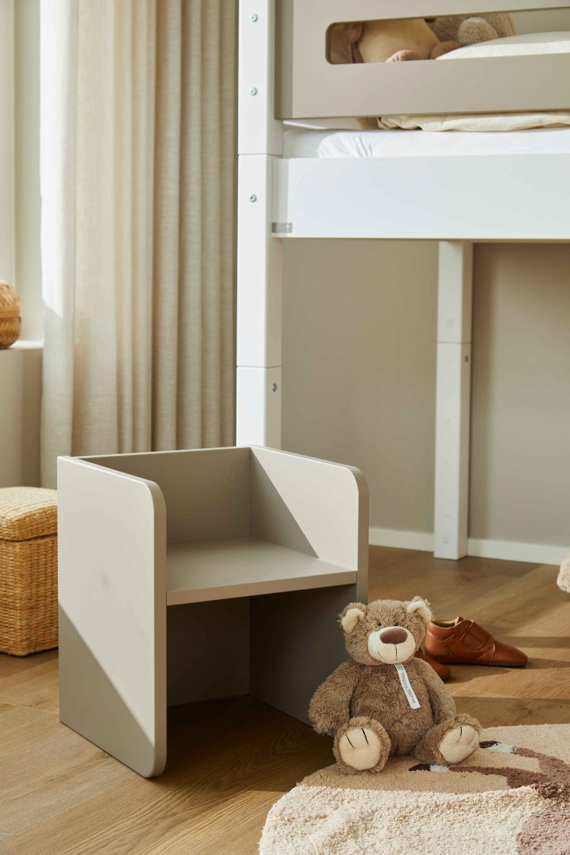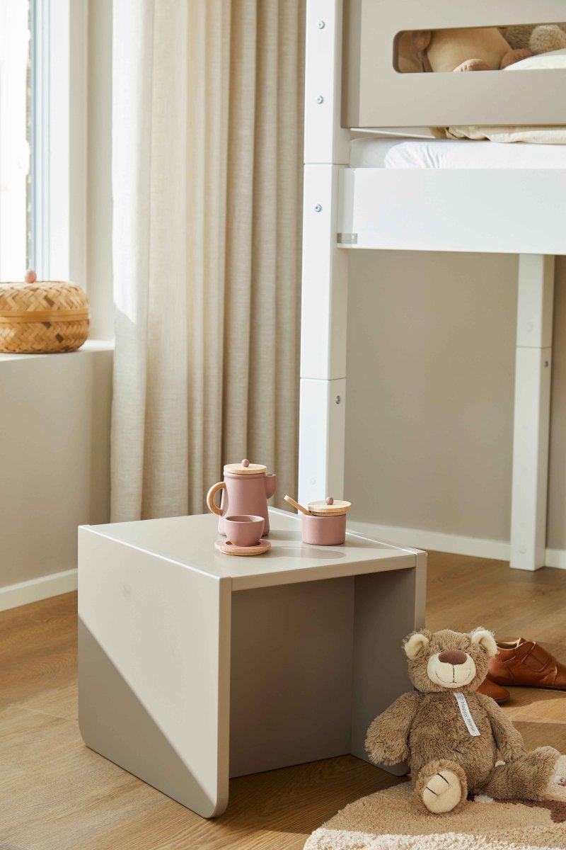 3-i-1 stol och bord - flexibel möbel för barnrummet Denna 3-i-1-möbel har utvecklats som en flexibel lösning för barnrummet och kan användas både som stol i två olika sitthöjder och som ett litet bord. Den enkla konstruktionen gör det enkelt att anpassa möblerna till barnets behov och vardagliga aktiviteter, oavsett om de används för lek, teckning eller lugna stunder. Möbeln är designad och producerad i Danmark och är en del av Manis-hs flexibla byggsystem, där funktionella lösningar kan anpassas och återanvändas över tid. Den tidlösa designen gör stolen och bordet enkla att integrera i olika inredningar och användningsbehov. 3-i-1-stolen kan konfigureras i upp till 14 vackra färger, vilket gör att du kan skapa ett personligt och sammanhängande uttryck i barnrummet. Den robusta konstruktionen och den flexibla funktionaliteten gör möblerna lämpliga för långvarig användning allt eftersom barnet växer.