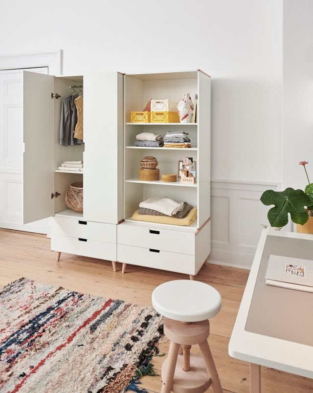Garderobskombination - komplett förvaringslösning för barnrummet Denna garderobskombination kombinerar två byråer med lådor, en garderob och en bokhylla med tre hyllor till en sammanhängande lösning för barnrummet. Kombinationen ger gott om plats för kläder, leksaker och vardagliga förnödenheter och skapar en tydlig och funktionell förvaringsmiljö. Lösningen är designad och producerad i Danmark och är en del av Manis-hs flexibla byggsystem, där modulerna kan kombineras och anpassas till rummets storlek och familjens behov. Den enkla och lugna designen gör garderobskombinationen lämplig för både mindre och större barnrum. Dörrar och lådfronter kan konfigureras i upp till 14 vackra färger, vilket gör att du kan skapa ett personligt uttryck som antingen matchar resten av hemmet eller barnets egen stil. En väl genomtänkt och långvarig lösning som kan utvecklas allt eftersom barnet åldras.