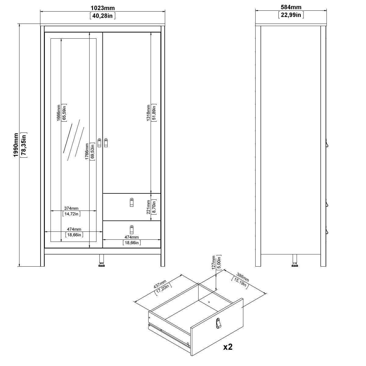Fält 3 – Mått i cm (L x B x H) 199,1x62,5x8,6